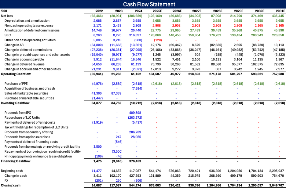 OneStream’s balance sheet is robust, with $652 million in cash (including $400 million raised at IPO) and no debt. Positive operating cash flow in 2023 and 2024 further underscores financial flexibility.